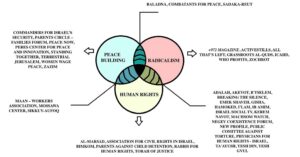 - Radicalism: Actors that label Israel as a colonial or apartheid state and its policies as war crimes, demanding sweeping systemic change. Strategies include economic boycotts, promoting the refusal to serve in the Israeli military, and pushing for recognition of the 1948 dispossessions and the Palestinian refugees’ right of return.